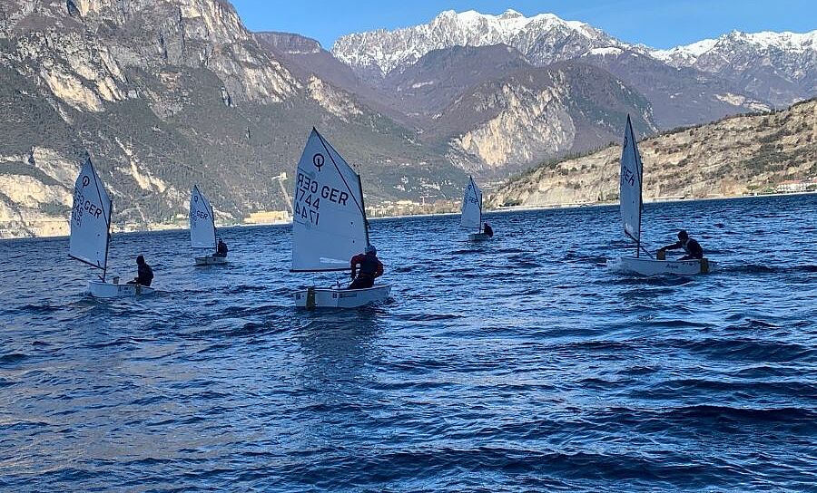 Während viele die frühen Faschingsferien heuer zum Skifahren nutzten, zog es acht Optimisten mit Trainer Poldo an den Gardasee. Wer am Freitag anreiste, wurde vom Gardasee mit 17 Grad und Sonne begrüßt, am Samstagmorgen zeigte sich der Gardasee eher regnerisch. Das tat der guten Stimmung aber keinen Abbruch und wurde dank des guten Windes sofort für einen effektiven ersten Trainingstag genutzt. Kaum auf dem Wasser zeigte sich für so manchen, dass der über den Winter vorhandene Wachstumsschub zu einem neuen Gefühl im Opti führt: wo man im Herbst noch locker unter dem Baum durch passte, musste man jetzt deutlich gelenkiger sein. Aber die anschließenden Tage wurden intensiv dazu genutzt, um wieder „reinzukommen“, Techniken zu verfeinern und Trainingsrennen zu fahren.