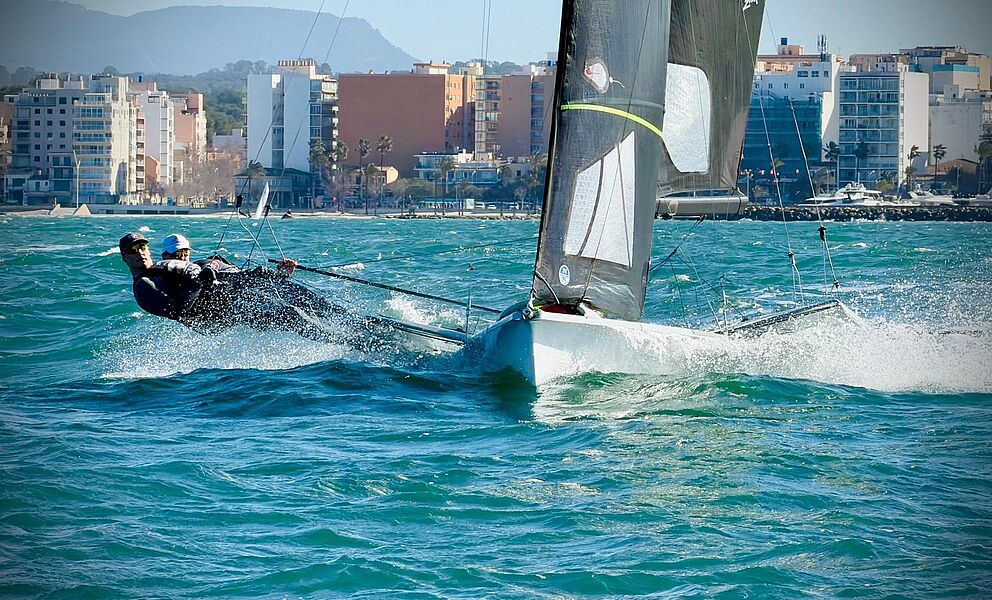 Auch im 49er wird der Winter konsequent genutzt. Lucas und Moritz trainieren seit Dezember in den Schulferien regelmäßig auf Mallorca und bereiten sich dort gezielt auf den Einstieg ins internationale Seniorenfeld vor.